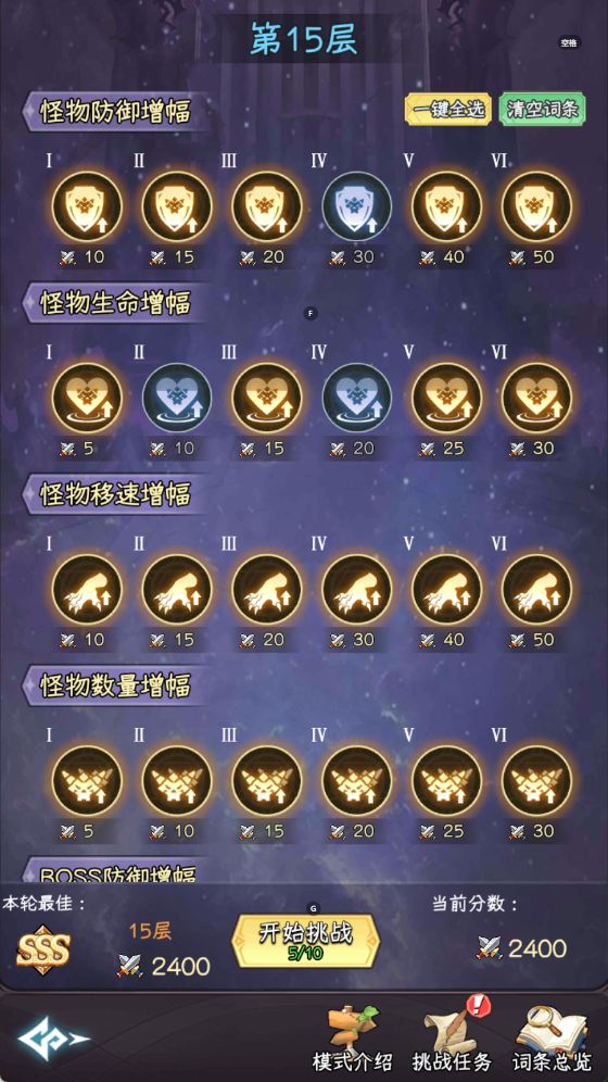 深旋秘境前期尽可能拿完奖励的攻略,需要一定基础配置。15层之前看任务积分要求。达到最后一档积分就可以过关了。需求积分前全buff全选,然后根据积分减少小怪跟boss的防御跟生命的词条按需减少。优先boss其次小怪。赐福只选战意。