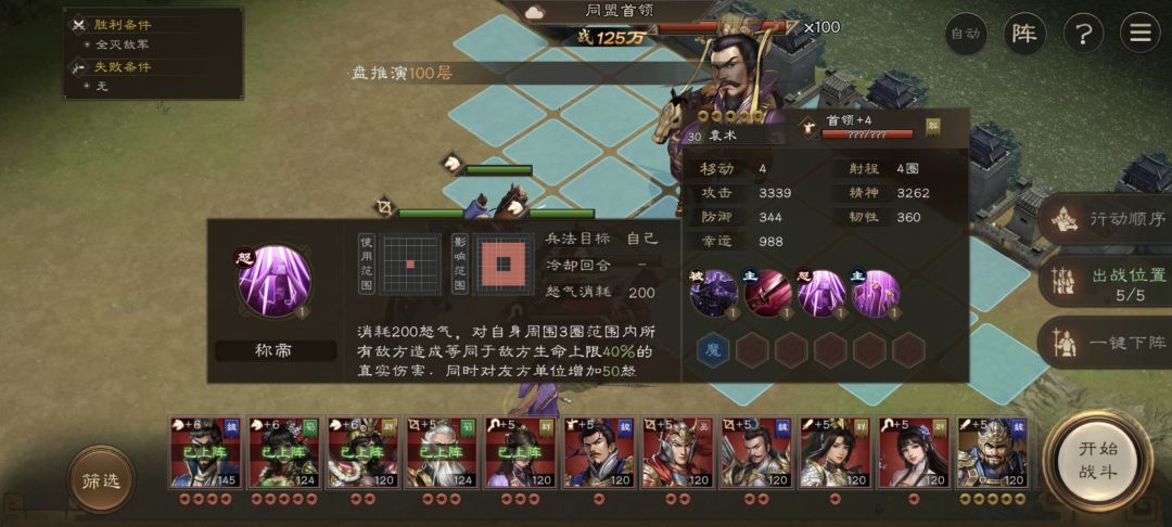 其他技能都还好说,而且boss面板也很低,但是这个大招就有点离谱了,居然是高达40%的百分比扣血,所以打的时候注意一定要上一个奶妈,这个技能范围是3圈,躲不掉的。其次不同于我方袁术,这个技能不会给敌军回血,因此上袁术互相刷怒气多开一个大招的打法是无效的。