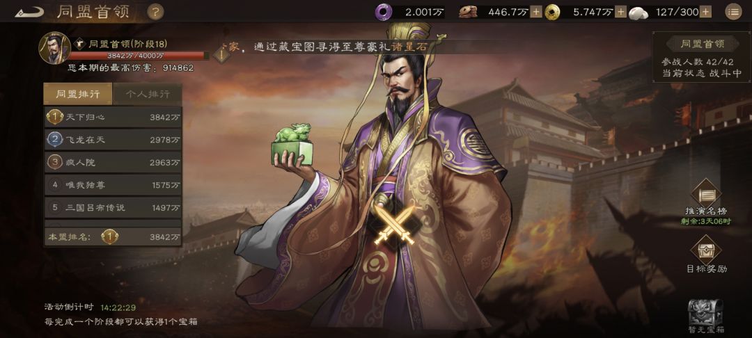 第二天加入同盟之后,就可以攻打同盟boss了,攻打boss能获得大量装备和锻造材料,首通阶段还能获取大量的抽卡道具,由于有一个个人伤害排名,所以我简单说下打boss技巧