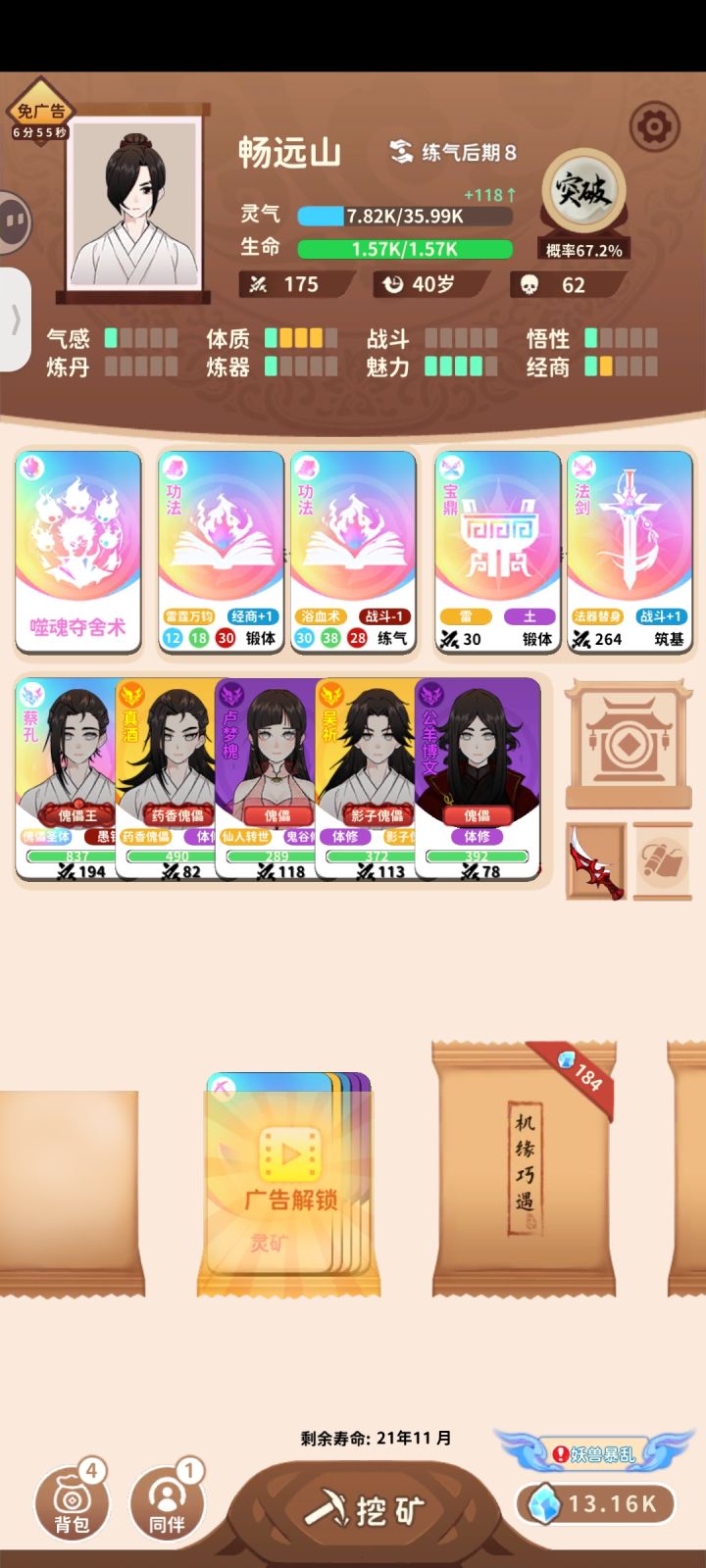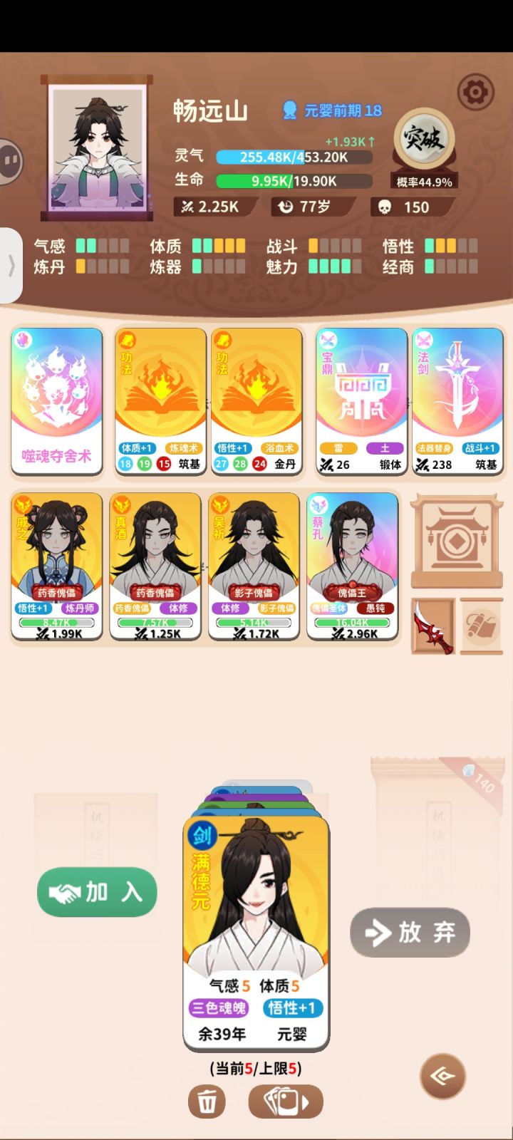 要玩好这要玩好这个东西,你得需要一定的运气,前者只要你能获得。玄子道友即可,后者你要有一定的运气如图二比较介意的搭配,就是将道友拉满其次就是浴血术外加断体神术,加上炼魂术如果看到了105个广告,非常建议再加一个恶魔树叶,毕竟能加五倍的血量上限,对于夺舍术是非常适合的为什么适合呢?因为按照夺舍数的情况来看,这个他夺舍之后最高只有九年的使用时间,如果九年一到就得重新再选,夺舍人选当然,这是后者的搭配,前者建议搭配盾术一类的跑得快就行,一定要有2到3个法器替身到时候打不过了,直接跑,多和玄字道友结交这种流派只需要跑寻找夺舍目标,然后境界也会慢慢提升上去然后我一般是玩的后者,对于后者比较建议多存几个将军傀儡傀儡王只需要一个,如果傀儡王很多的话,是不触发傀儡王的特殊效果的将军傀儡能替其他傀儡扛伤,然后也需要搭配一个药箱傀儡前期基本上就是靠自己打伤害,后期基本上是靠傀儡打伤害,所以建议多存几个将军傀儡,后面如果将军傀儡遭受的伤害太多,死了的话也可以快速换我之前也是因为将军傀儡死了,然后后面几乎伤害全打我身上了,然后我也死了,所以将军傀儡一定是重中之重,你可以没有傀儡王也可以没有其他特殊傀儡,但一定要有将军傀儡不帮你扛伤的话,很容易死的,其次一定要带法器替身,一定要带不然的话,除非你带了很多个将军傀儡,不然的话,包死的