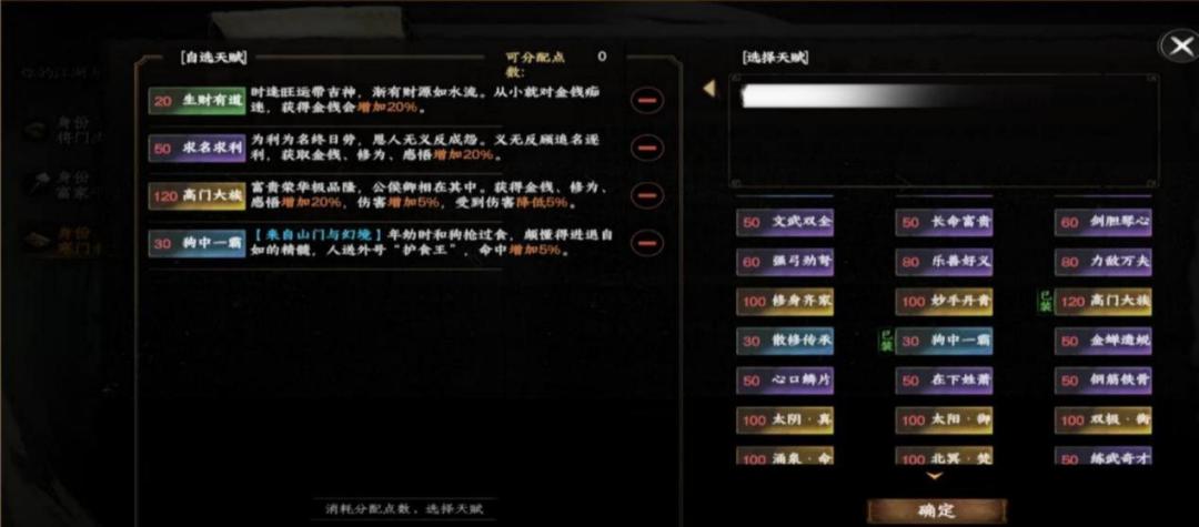 2. 为了节约发育时间,我们天赋选择增加金钱、修为、感悟 的(生财有道、求名求利、高门大族),第一次玩天赋点不 够的话可以只选求名求利。