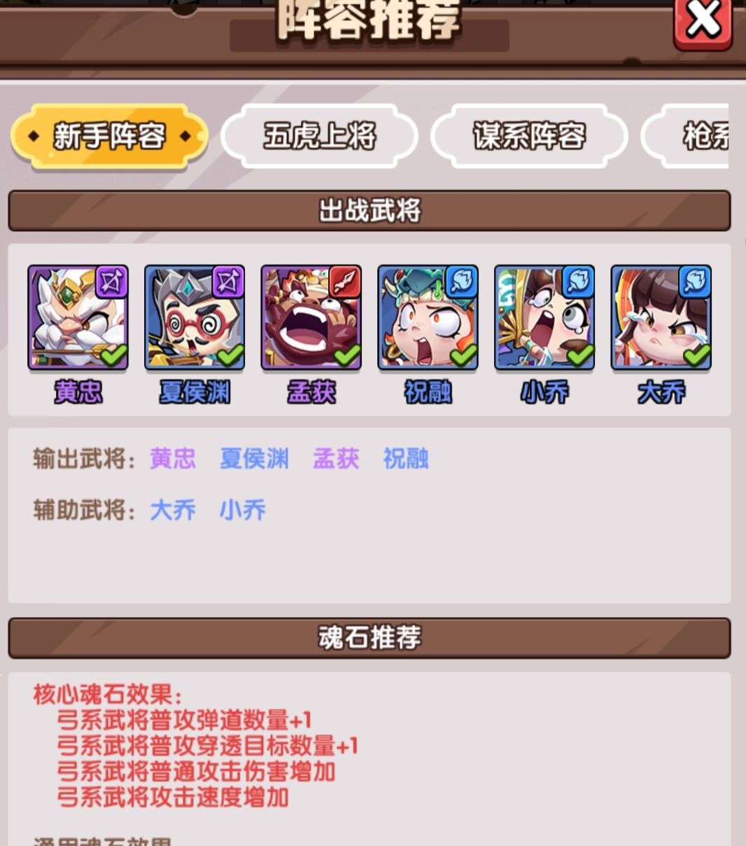 前期推图建议以黄忠夏侯,孟获夫妇和大小乔为主,这个阵容可以支撑很久一段,没有抽到黄忠的话可以换成随便两个武将。