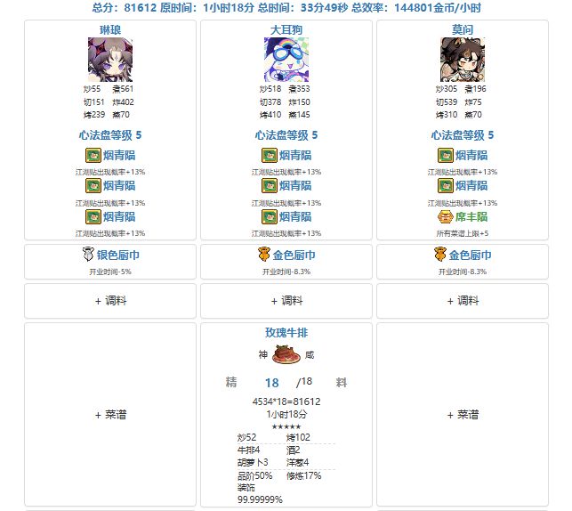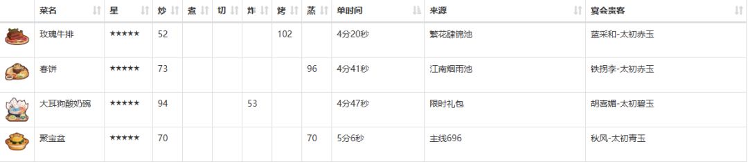 刷江湖帖只考虑四五火菜谱,且火数越高、品级越高则收益越高。