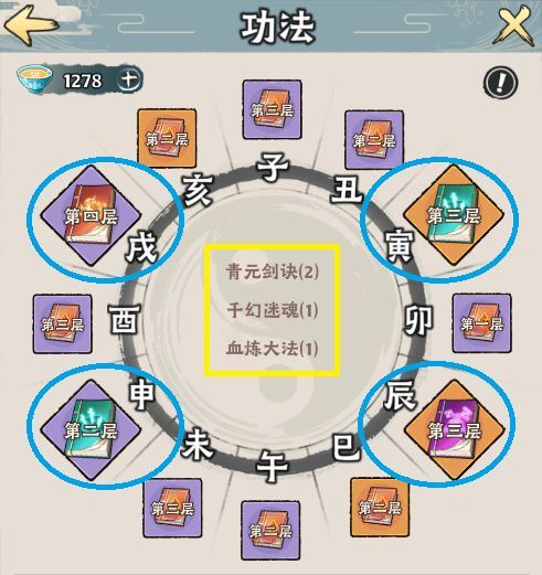 上图中,4个蓝圈圈就是特殊功法的对应位置,中央黄框框内显示的是当前所拥有的特殊功法及其数量。有别于普通功法,特殊功法不仅可以提供属性加成,还能够激活相应的套装效果,如下图所示: