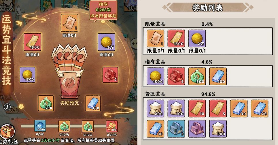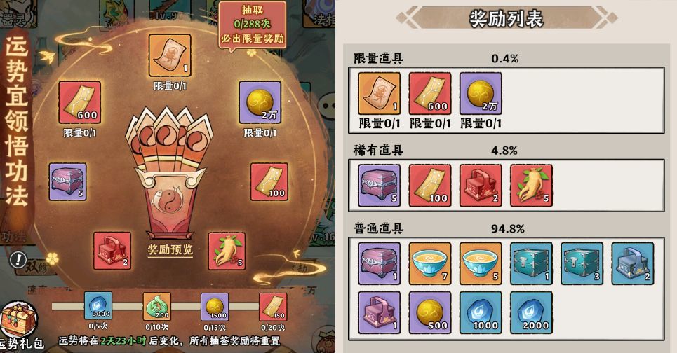 当前版本的四大运势为:炼制装备、斗法竞技、后山采集、领悟功法。每种运势持续3天,结束后换下一种运势,依序轮替。下面给出四大运势及其奖励一览,大家可以根据自己的需要,有针对性地囤积幸运签。