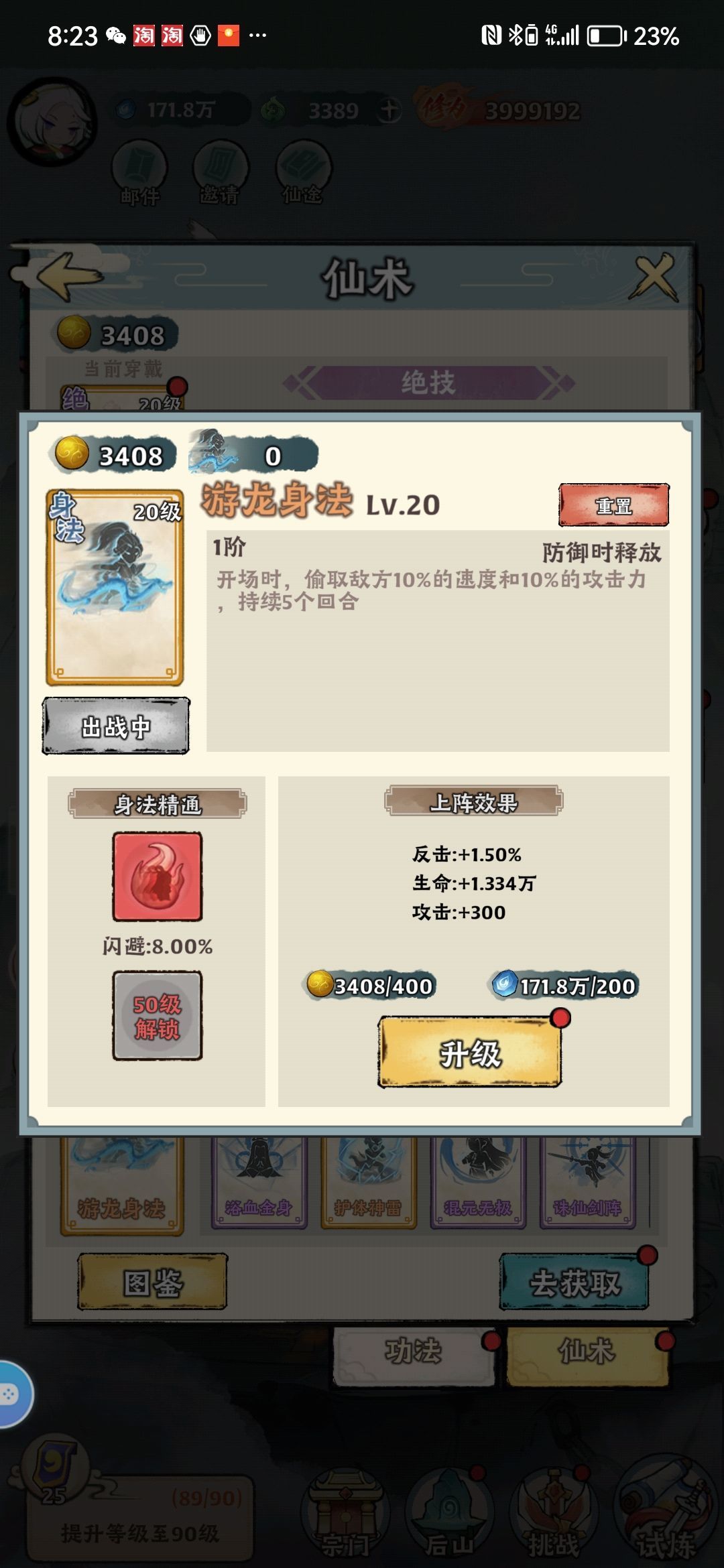 3,仙术,仙术选择,游龙身法必备,其他随意,精通方面速度必须挂上去,因为急速击晕,必须比对手速度快,你先出手击晕对手,而且击晕无法闪避,克制闪避流连击流,只要你先出手晕眩住,他们都是弟弟。所以这个游龙身法必须要,前五回合偷取对方百分之十的速度和攻击。