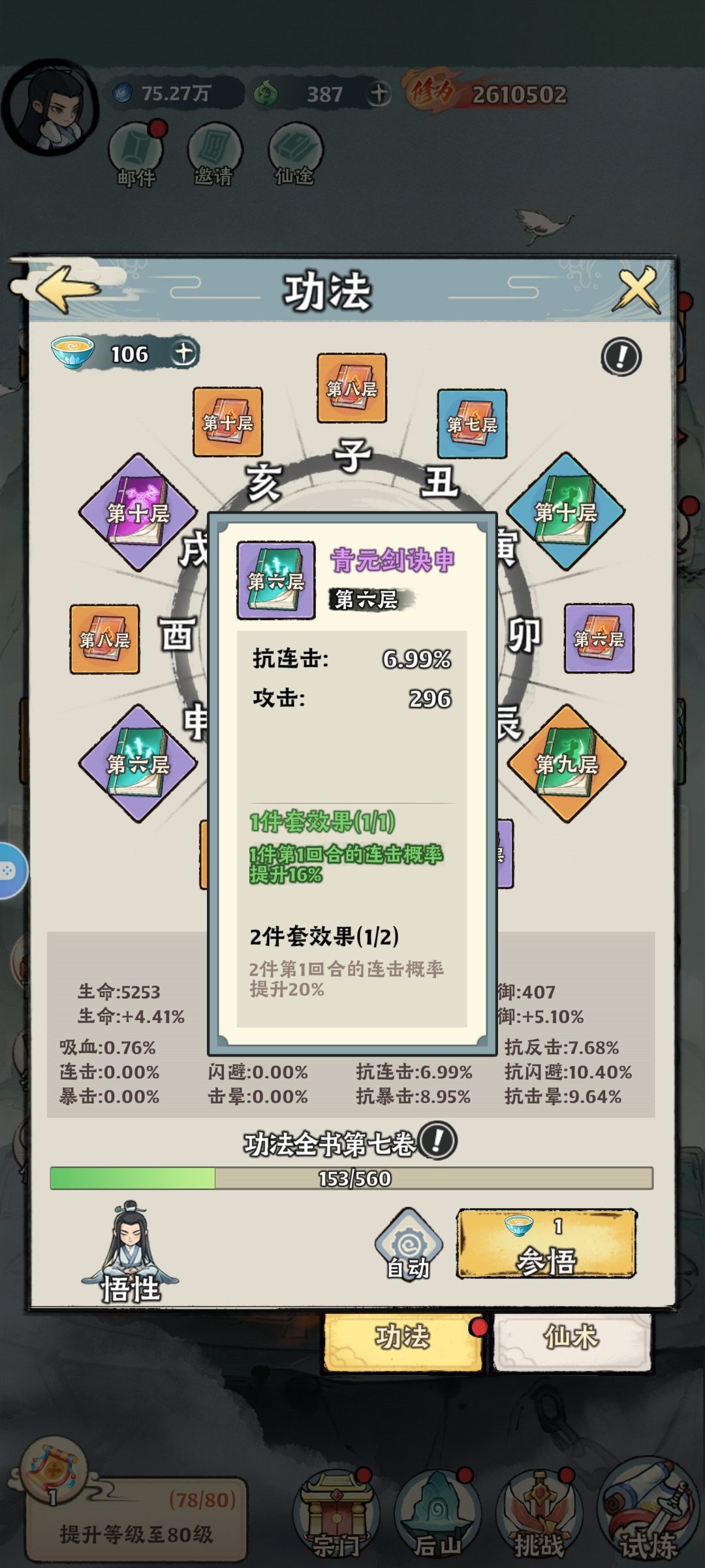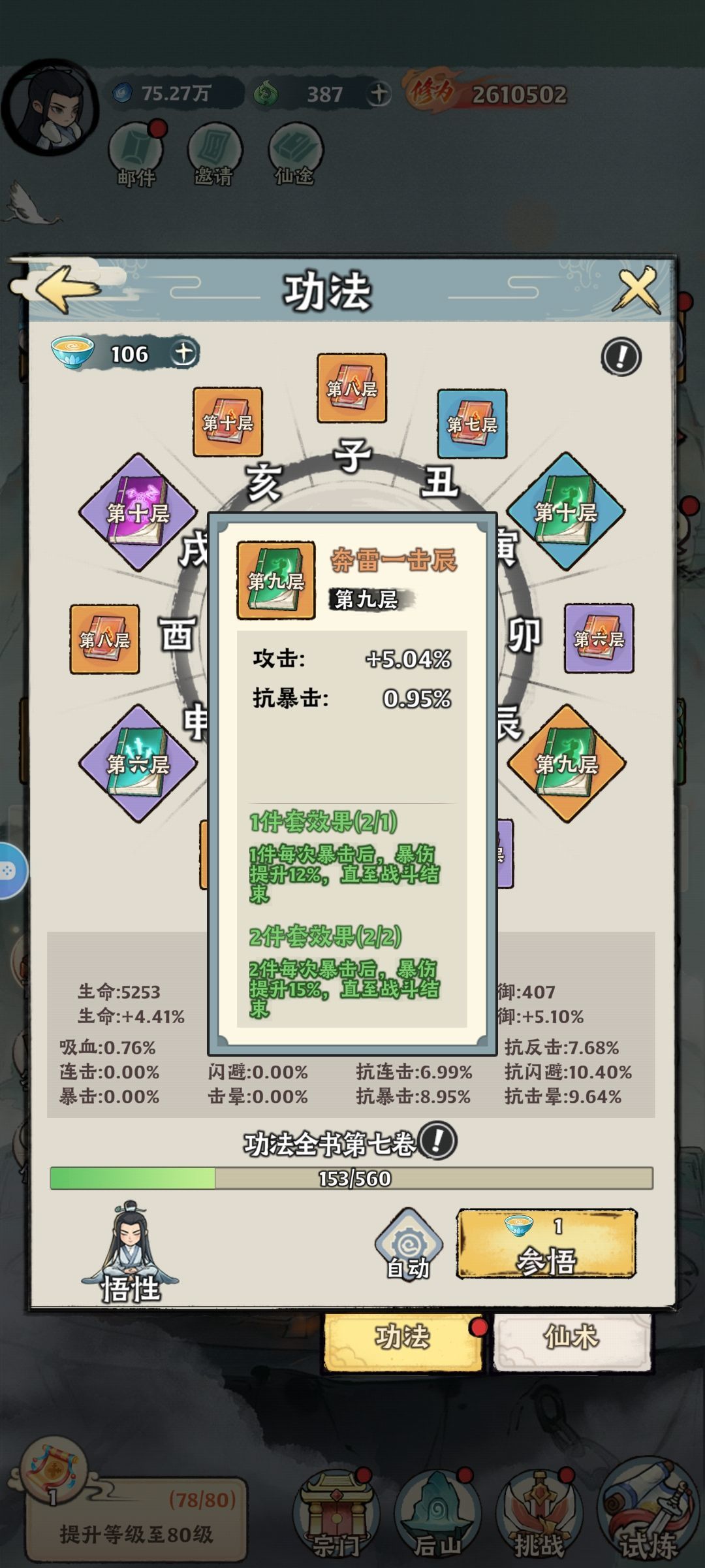功法方面必选奔雷一击和青元剑诀,主要还是奔雷一击加暴击后加爆伤,青元剑诀一个就行加连击。