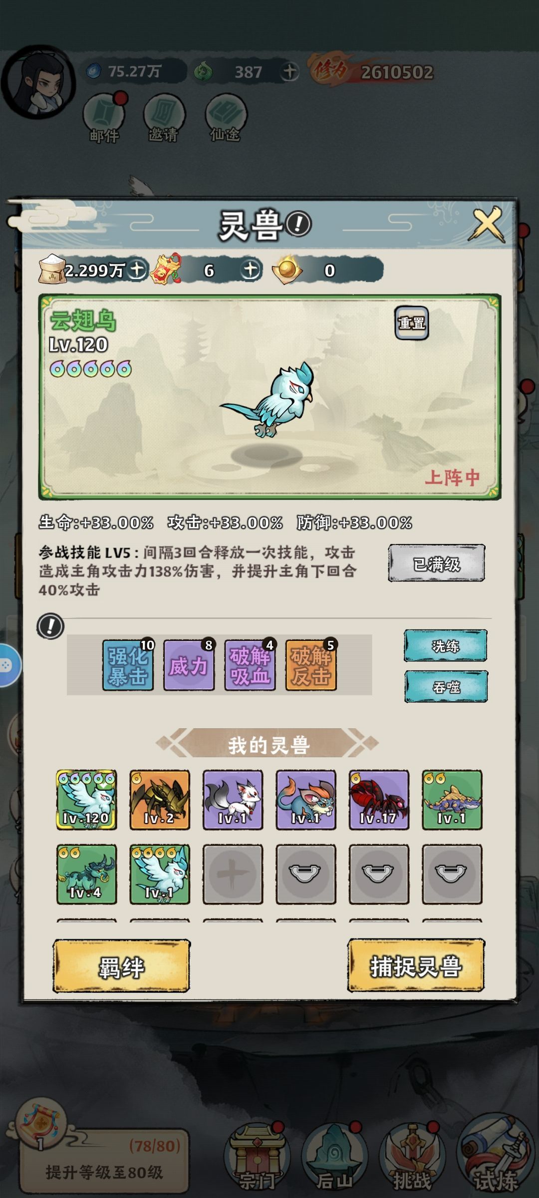 灵兽有条件就选择应龙,(氪佬的选择,咱这边也不多说了)推荐:还是养绿色鸟(赌狗成分),刷个增加爆伤,强攻,嘎嘎猛一路所向披靡。(我这个鸟是废了。刷鸟以及吞噬的细节就不在这里说了,论坛上搜索就会有,很详细)祝每个修仙者运气爆棚!