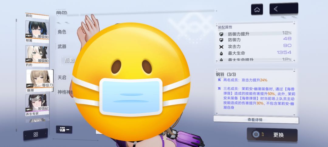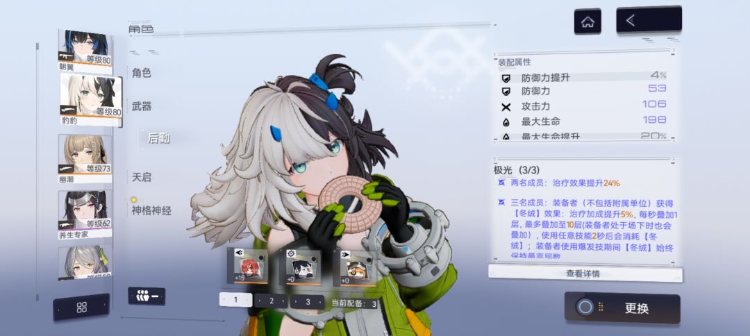 辉夜和豹豹是1天启完全体,幽潮辅助2天启完全体,辉耀3天启完全体。辉夜随便活动后勤均有增幅,后期可刷增幅提升较大的后勤为阿玛纳小队,辅助冰冻C则用专属后勤和4星5星专武。
