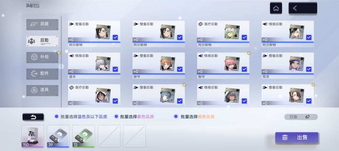 后勤1-12级需要25个紫色,1-15的话是50个紫色2个绿色。没错这里对萌新有个资源小坑,在萌新没有重修道具前,直接升15不如先升12再到15的性价比高。
