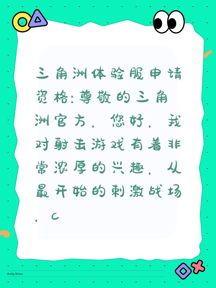 三角洲体验服申请资格:尊敬的三角洲官方,您好,我对射击游戏有着非常浓厚的兴趣,从最开始的刺激战场,cf,荒野行动,到后面的pubg,暗区突围等等一系列射击含战术配合的游戏有着极高的兴趣。本人对这款三角洲游戏的两个模式都玩,虽然段位不高但是兴趣极大,对于这次的测试服有着浓厚的兴趣,本人保证 ,我会从各个武器的强弱进行测试,认真记录问题并及时反馈问题,我承诺严格遵守测试规则,不泄露任何未公开内容,很愿意的配合游戏的策划大大让这款游戏变得更好