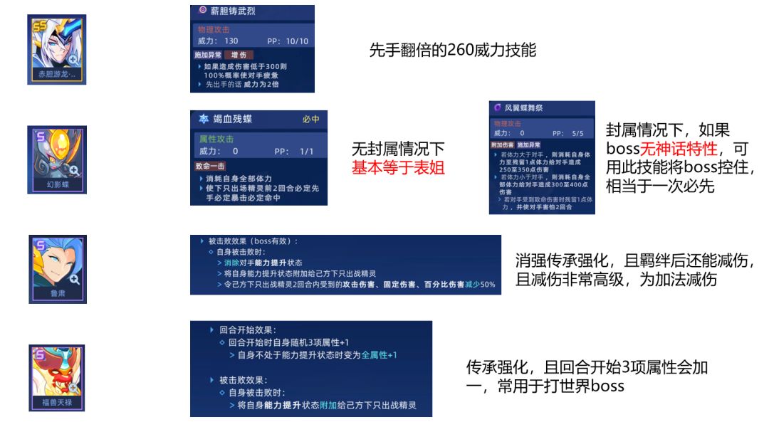 幻影蝶在不封属的情况下约等于表姐,甚至一些判定比表姐更高级。现在有很多boss无神话,可以用零威力技能自爆控住boss,相当于下一只精灵必先。不过要注意boss没免控,技能发动的条件以及下一个出场精灵血量要能抗住boss的锋锐。
