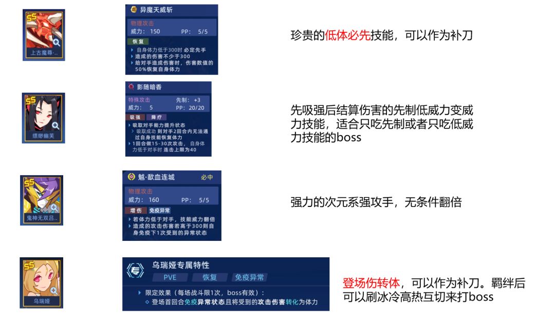 乌瑞娅未羁绊前有一次登场伤转体,和不死补刀精灵的作用差不多。羁绊后可以多次触发伤转体,配合冰冷高热特性可以互切来击败boss和龙妈互切类似。