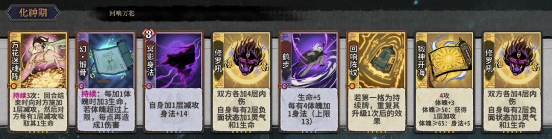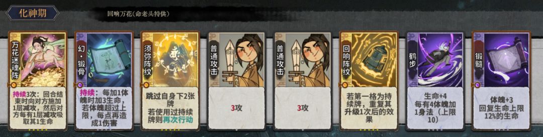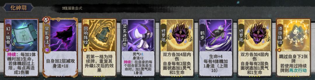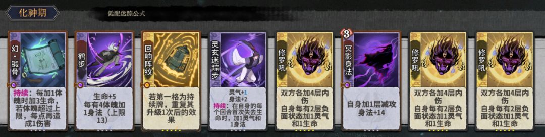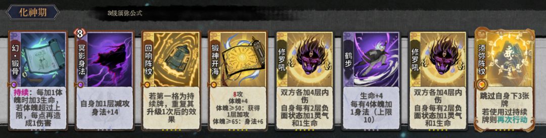 如果须弥只有2级,可去掉金书换成迷踪步来减少一张跳牌需求,强度基本不变,不过对身法的要求更高。对于有三动杀能力的低成长对手同样是将第一个回响换成锻髓,这里不再赘述。