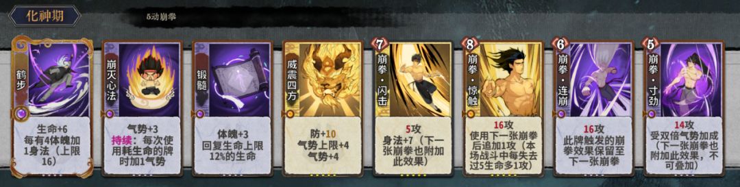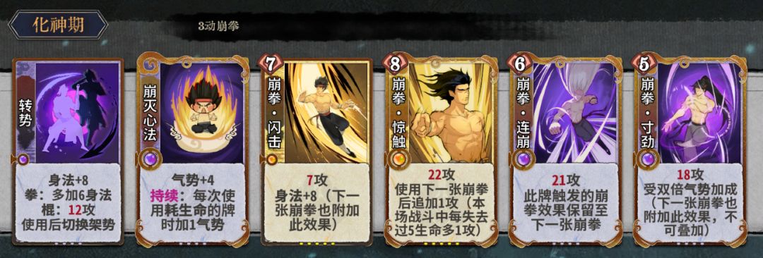 再动牌:两张转势+一张鹤步/冥影。这里提醒一下新手道友,鹤步再动需要40体魄,7~8轮要提前锻体配合,第8轮有需要可以提前吃1张;冥影会减攻需要放在棍形态用志坚挡住(除非配合截脉);有2张冥影千万别合。不要打出后招鹤步、减攻自己的下饭操作,当然更不要荷重身法。