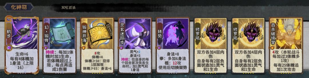 11轮上化神大d。绝大部分情况下可以吃掉拆招上本,除非元婴期的崩拳套很胡或者锻骨套很胡否则不是很建议吃棍。在化神初期阶段我们有四套过渡方案,脸不是太黑的话都能凑出一套: