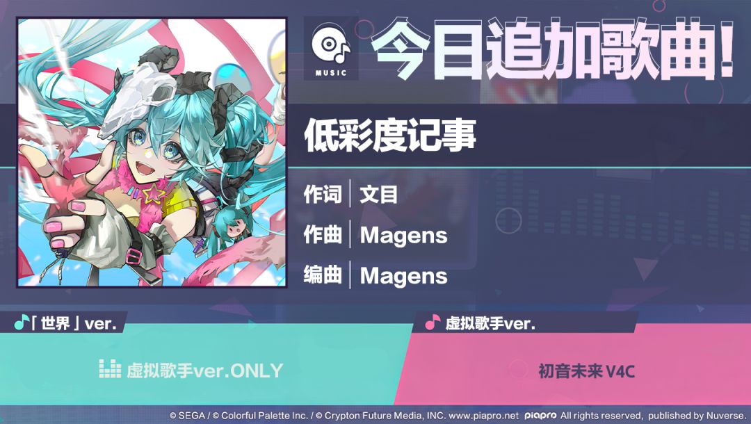 7/1 15:00起,将追加《初音未来:缤纷舞台》首届歌曲征集活动优胜歌曲《低彩度记事》!
