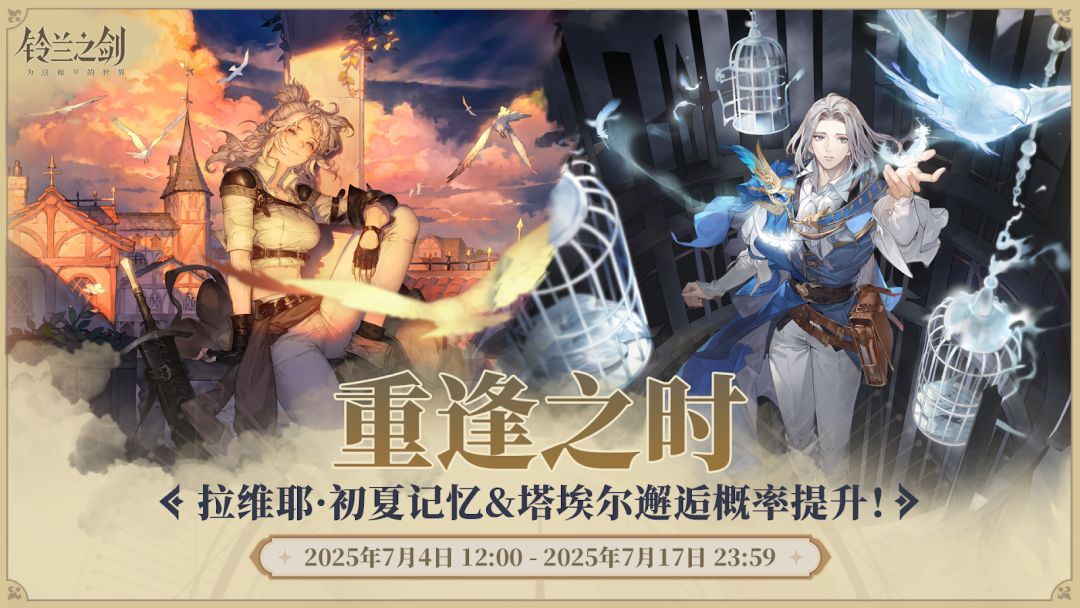 「重逢之时」限时邂逅将于 2025/07/04 12:00 - 2025/07/17 23:59 开启,传说角色「拉维耶·初夏记忆」、「塔埃尔」邂逅获取概率将大幅提升!