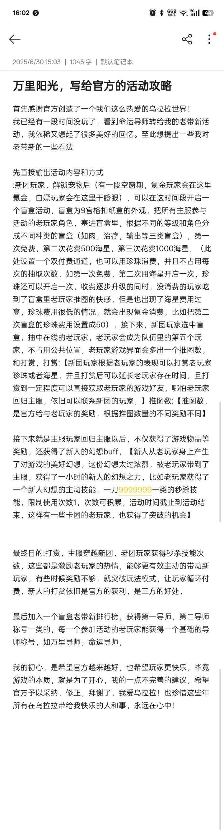 我的初心,是希望官方越来越好,也希望玩家更快乐,毕竟游戏的本质,就是为了开心,我的一点不完善的建议,希望官方予以采纳,修正,拜谢了,我爱乌拉拉!也珍惜这些年所有在乌拉拉带给我快乐的人和事,永远在心中!