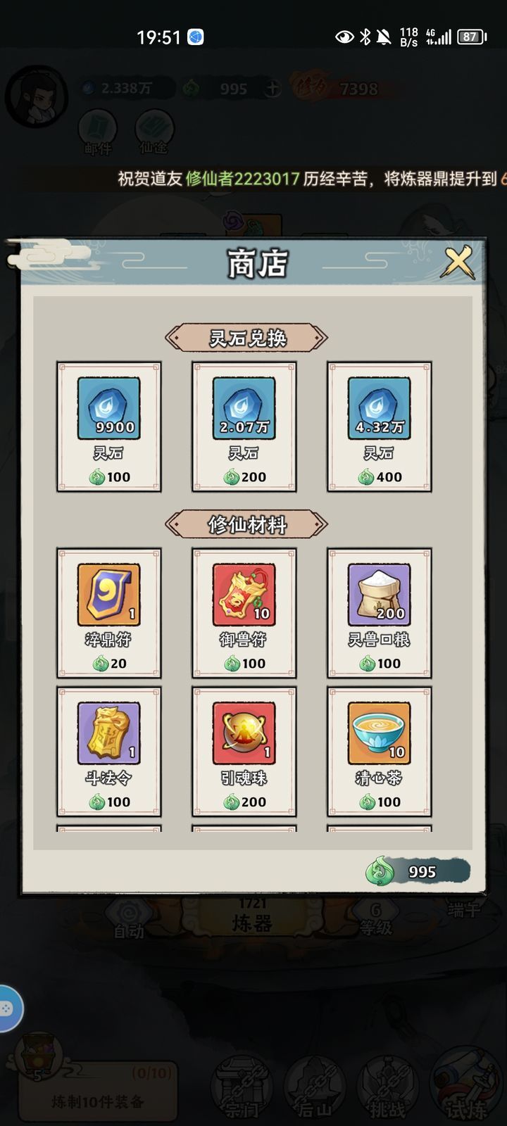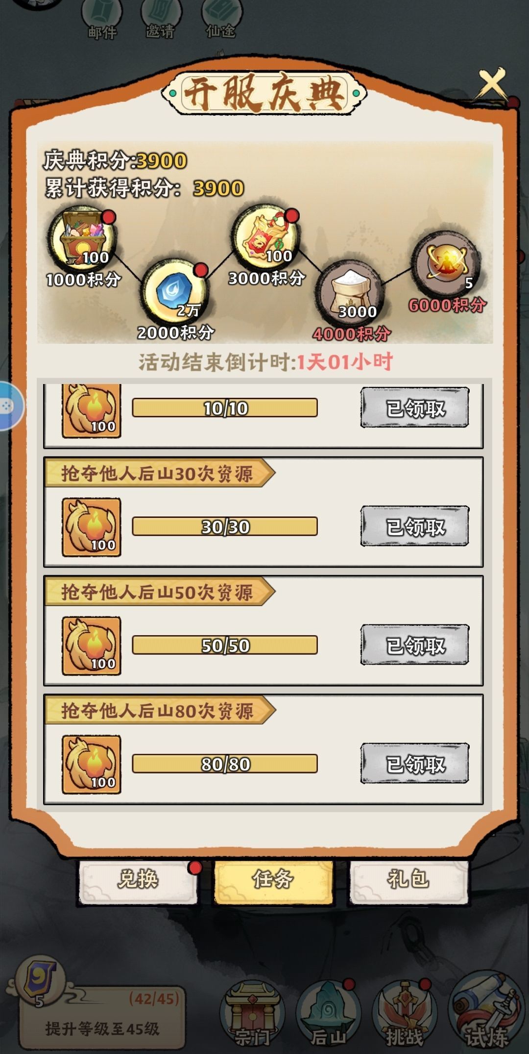 庆典【完成任务情况:炼器2000即可;境界达到元婴即可:炼器鼎升级到七级;穿戴上品装备,或者运气好穿戴极品装备也是有机会的;法相忽略不做;斩妖15次;后山采摘80次(快速完成方法:点击采摘——立马召回——再点击采摘,只能这样反复操作,抢夺他人后山同理);抢夺他人后山80次;异兽10次;灵兽升级50次,或者100次;灵兽抓捕能抓十五次就抓,不能的话也是无所谓,随缘玩法嘛。这样操作下来,保底能完成4000积分,兑换优先选择引魂珠>御兽符>悟性果>清心茶>法相残篇>小仙鼠食物>口粮>箱子】