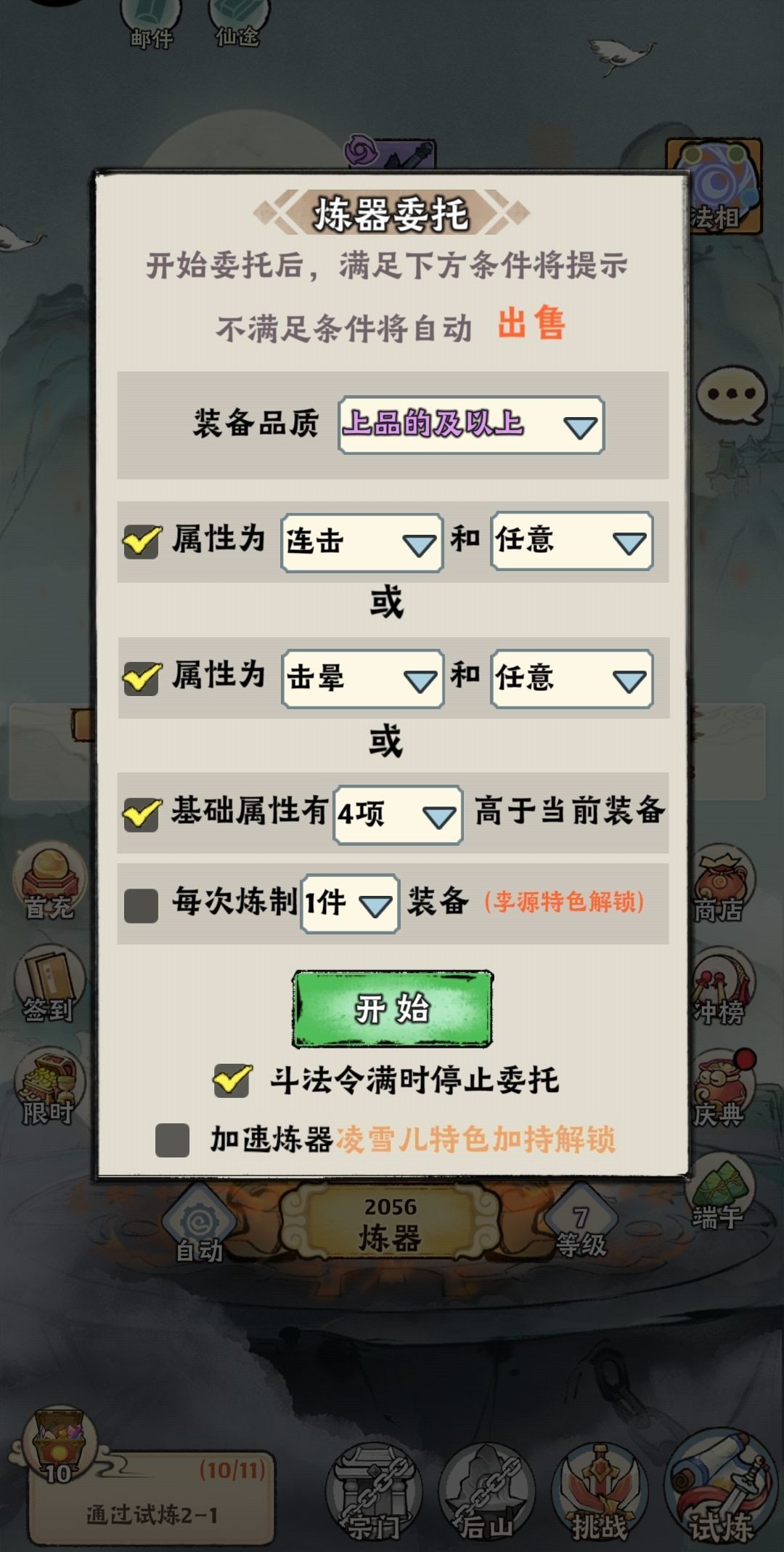 人物等级升到11级开启自动炼器,装备品质建议选择上品以上,属性前期可以连击,或者击晕,或者属性高于4项(刚开始,建议选择连击加眩晕,打试炼很好用,而且登录七天送的器灵就是击晕效果。所谓的其它流派,要有合适的器灵,灵宠,法相和仙术搭配的)