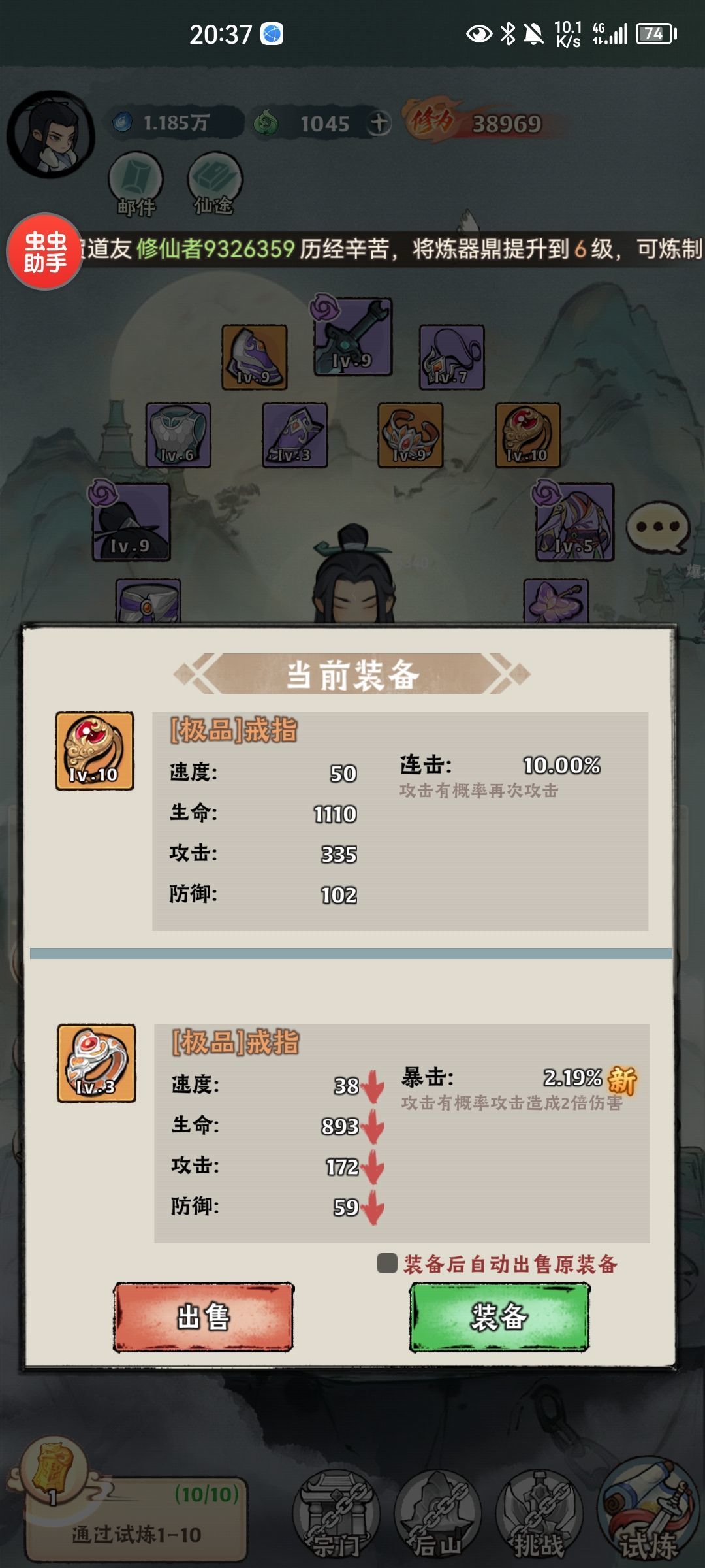 通关试炼1-10奖励一个十级的10%连击属性的戒指,后面还有一个十五级的10%连击属性的戒指,最 最 最 最主要的还有一个二十级的10%连击属性戒指(这个戒指一定一定要佩戴到八十级)。