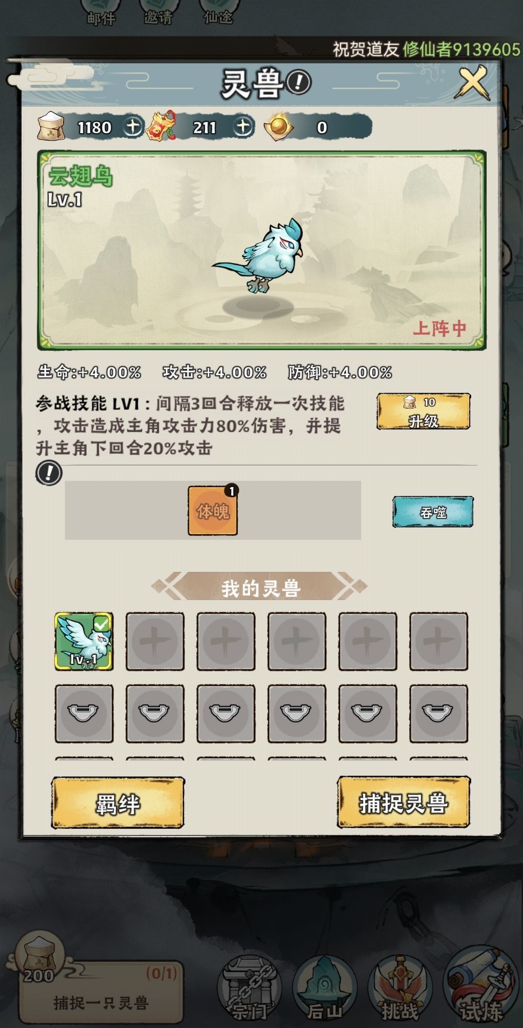 刚开始有灵兽口粮*1180,御兽符*211