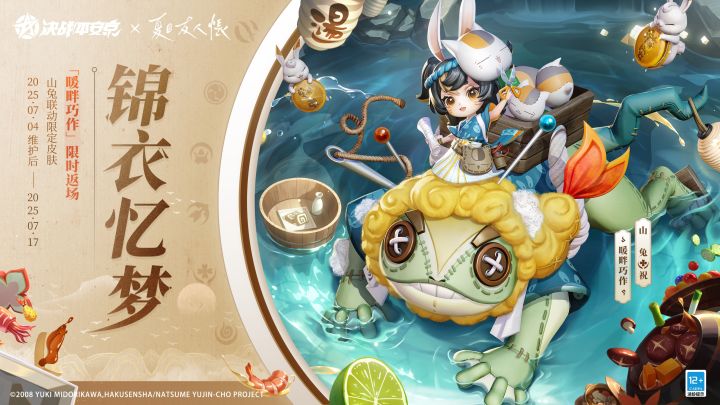 7月4日维护后-7月17日,《决战!平安京》×TV动画「夏目友人帐」联动即将再度开启!追月神联动限定皮肤「汤屋邂遇」、山兔联动限定皮肤「暖畔巧作」将限时返场上架服装铺!大人们请勿错过哦~