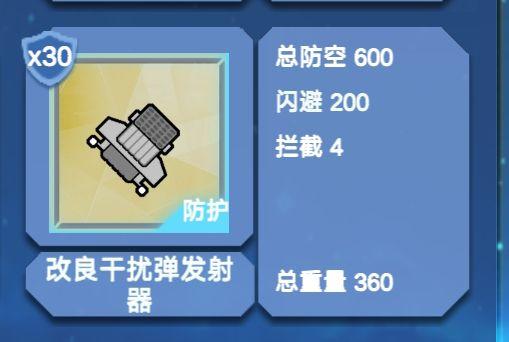 干扰弹:重量12,相比减振甲闪避更高、重量更低,提供少量拦截和防空