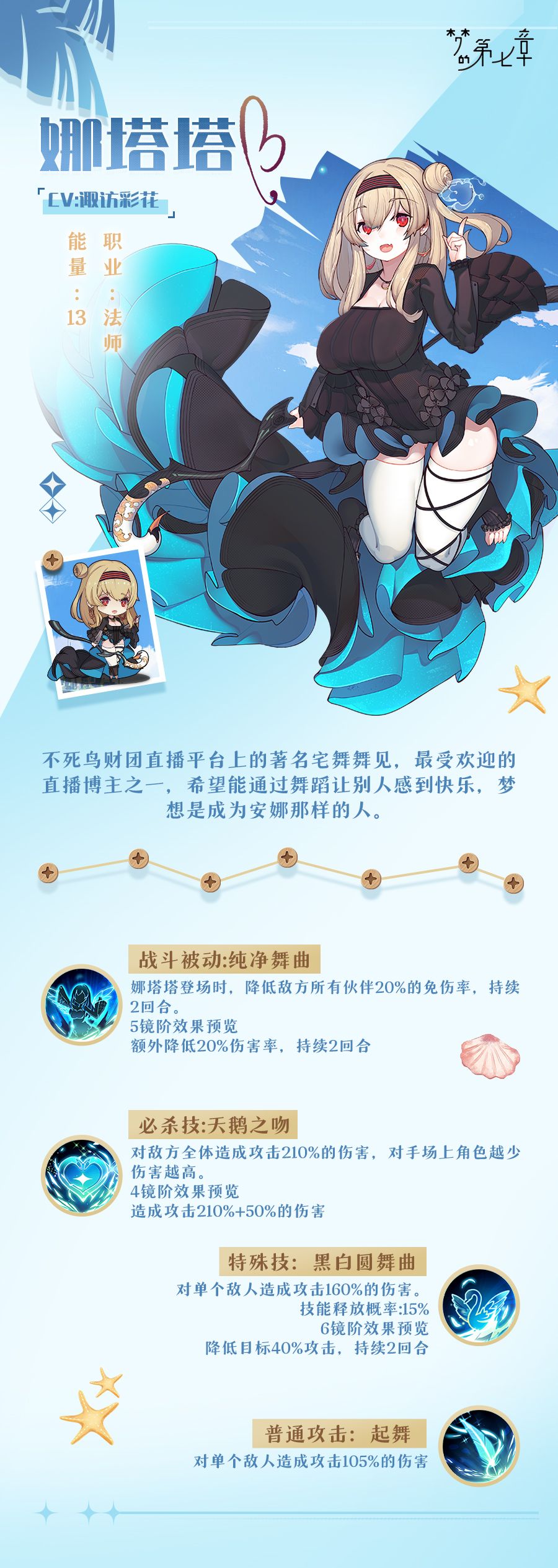 不死鸟财团直播平台上的著名宅舞舞见,最受欢迎的直播博主之一,希望能通过舞蹈让别人感到快乐,梦想是成为安娜那样的人。