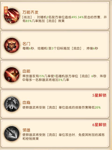 阵容思路:群雄的特性是对敌方造成流血效果,并针对流血状态的敌人,群雄武将的技能都有相对应的加成。在二赛季可以上场六个武将的情况下,无双武将也逐渐登场,阵容的搭配也就更加完善。袁绍是流血核心,能够百分百对敌方施加流血效果;董卓是阵容中的铜墙铁壁,有着一定的恢复能力与防御并且还能为己方武将解除控制状态,为阵容提供了一定的续航能力;吕布是阵容的核心输出,配合流血效果能够打出高爆发伤害;华佗是强力治疗,并且能够为己方武将提供免疫中毒buff;于吉能够给阵容的武将驱散负面状态并且能够施加随机增益;貂蝉是阵容中的控制,能够干扰敌方行动。
