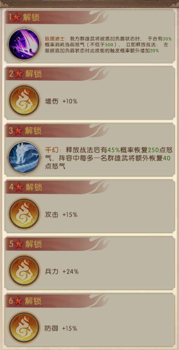于吉是团队的增益核心,他的技能能够驱散随机3名我方武将的负面状态并且能够使他们获得10秒的随机增益,并且自身就具有一定的免疫控制能力。于吉还有一定几率扣除流血单位的180点怒气,能够扰乱敌方的战斗节奏,在我方武将被施加负面状态时,不仅有几率能够免疫还能反弹施法者流血效果。在突破到三红后,只要团队被施加负面状态,于吉就有概率消耗不低于500的怒气立即释放必杀技,并且释放战法后还有几率恢复怒气,机动性很强,能让团队武将不惧大部分控制技能。