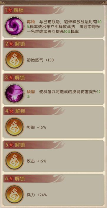 培养推荐:这套群雄中期的阵容,吕布还是负责主要的输出,袁绍是团队的机制启动核心,董卓是肉盾坦克,华佗是治疗核心,于吉提供增益与负面状态驱散,貂蝉负责主要控制。袁绍和吕布都可以在酒馆中招募获得,每日可以抽取一次心愿红将,招募到手后便停止,将招募令留至第二日再抽。在袁绍与吕布都六星并且天赋五重天之后,优先招募吕布,因为吕布控制着团队造成伤害的能力。在无双红将上面优先培养董卓,保证团队的生存能力,其次是华佗、于吉与貂蝉。在突破方面,可以先使用通用的突破石将所有无双武将突破到三星,然后将董卓升到六红,保证团队的坦度。吕布的突破石可以通过各种渠道的活动获得专用突破石,将吕布提升至六红。