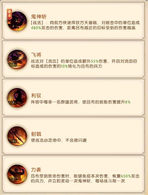 吕布是前中期群雄阵容的核心输出,流血效果能够为吕布带来高额的增伤与少量的恢复,吕布的强势期是在突破到三星之后,他的必杀技伤害会得到巨额提升并且在鬼神斩造成暴击后额外恢复200点怒气,能够让吕布快速打出持续的高额伤害。