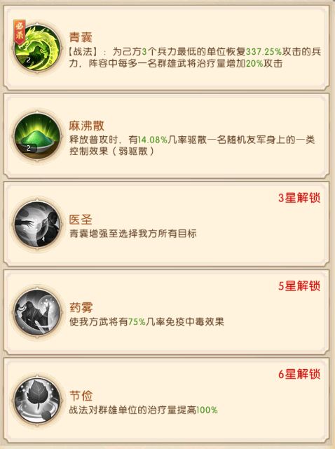 华佗是团队中的群疗奶妈,拥有非常优秀的群体治疗,并且在突破一红之后能够消耗怒气为我方输出抵挡一次致死伤害并为其恢复一定的兵力,冷却时间是5秒,能够在关键时刻发挥优势,为团队增加容错率。在突破到三红后大几率为团队武将提供长达6秒的霸体状态,团队中有华佗的存在,能够提升大幅度的续航能力。