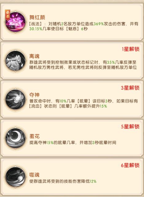 貂蝉是团队的控制核心,将她突破至一红后能够与吕布协同,当貂蝉释放必杀技的时候,吕布也将一同释放必杀技,并且貂蝉的技能有一定几率反弹敌方对我方武将的控制效果以及状态标记,能够与其余三国的特性状态制衡,还有一定几率眩晕敌方武将,并且她的技能还能为我方武将带来减伤与增伤的增益。