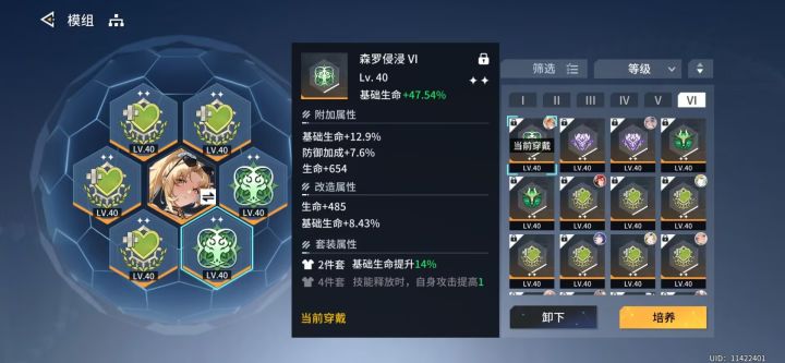 四生命两森罗,可以不带速度,保证有两个生命就行,456主词条生命/生命/基础生命,改造相同。技能一个都不用点,一般只用来消耗克里安卡的回火。武器洗双生命即可。
