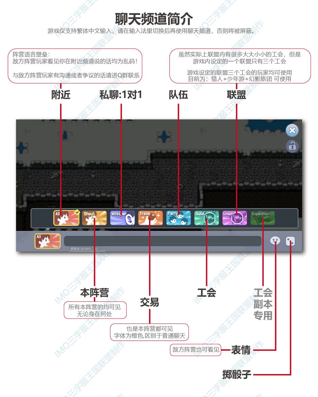 (7)Union - 联盟频道:联盟公会成员一起聊天的频道。联盟频道只能由三个组成联盟的公会可以使用,并不是指游戏外的联盟公会,比如目前赛斐亚王国联盟的联盟频道主要有两个,例如,主会频道由猎人+少年游+幻影旅团三个公会成员组成,萌新公会频道由(举例)联盟公会1+联盟公会2+联盟公会3三个公会成员组成,这两个联盟频道不能互通。