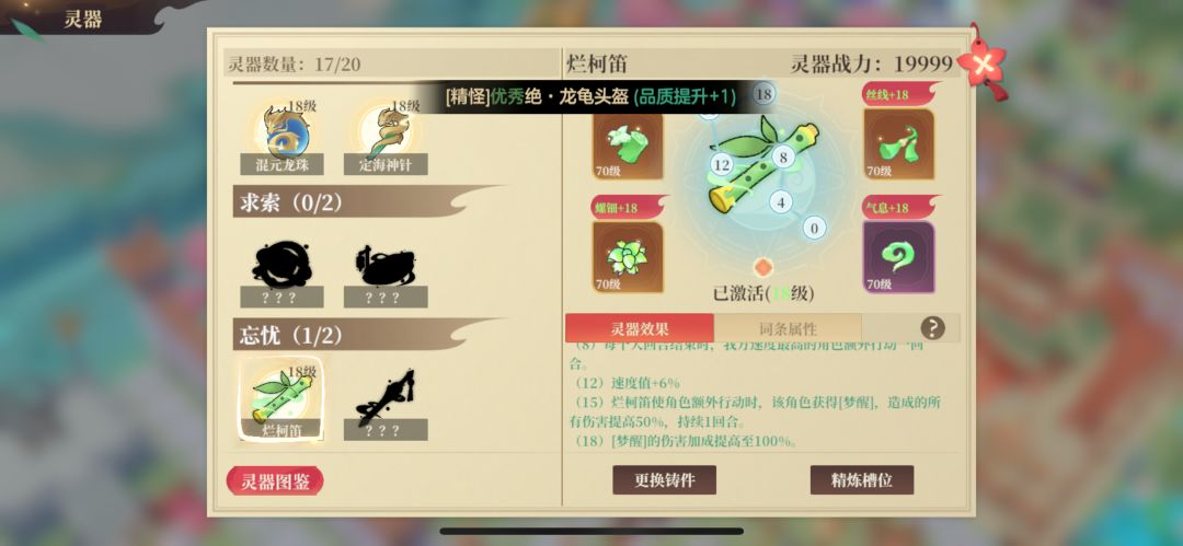 满级烂柯笛:已方角色每行动5回合(不计算额外行动),使己方攻击最高的输出定位角色额外行动一回合,每个大回合结束时,我方速度最高的角色额外行动一回合,额外行动时所有伤害+100%