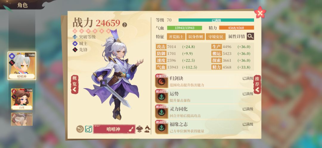 佟遇春:运势,灵力同化,天灵充能;城主:运势,神行术,福缘之志;奶妈:福缘之志,连横,气竭