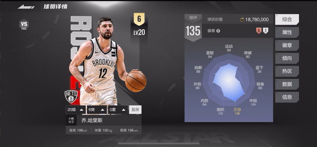 乔・哈里斯,这位身高 198cm、臂展同样为 198cm 的锋卫摇摆人,在 2014 年 NBA 选秀大会上,直到次轮第 33 顺位才被克里夫兰骑士队选中。进入 NBA 初期,哈里斯的职业生涯并不顺遂。直到加盟布鲁克林篮网队,哈里斯才迎来生涯转机。他凭借精湛的三分射术逐渐崭露头角,在 2019 年全明星三分球大赛中,力压群雄夺得冠军,一举奠定其在联盟顶级三分射手的地位。如今在【美职篮全明星】中,哈里斯依旧是不可忽视的外线火力点,其综合能力值 135(2019 年篮网数据),在特定战术体系中能发挥出巨大作用。王朝模式里,他是拉开空间的优质射手,街头局中也能凭借一手三分成为改变战局的关键人物。