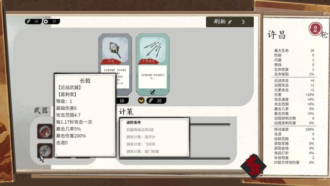 简单来说《斩将夺旗》是一款侧重于让玩家不断肝的游戏,虽然与《土豆兄弟》一样最多装备6件道具,但是刷新道具并无类似土豆兄弟的规律。《斩将夺旗》有武器进阶系统,具体表现为某件装备达到五级、且玩家同时持有与这件装备相关的三个典故道具,就可以将其进阶。比如说玩家有5级的戟而且有飞将军、辕门射戟、连环计三个词条就可以把戟进阶为方天画戟。