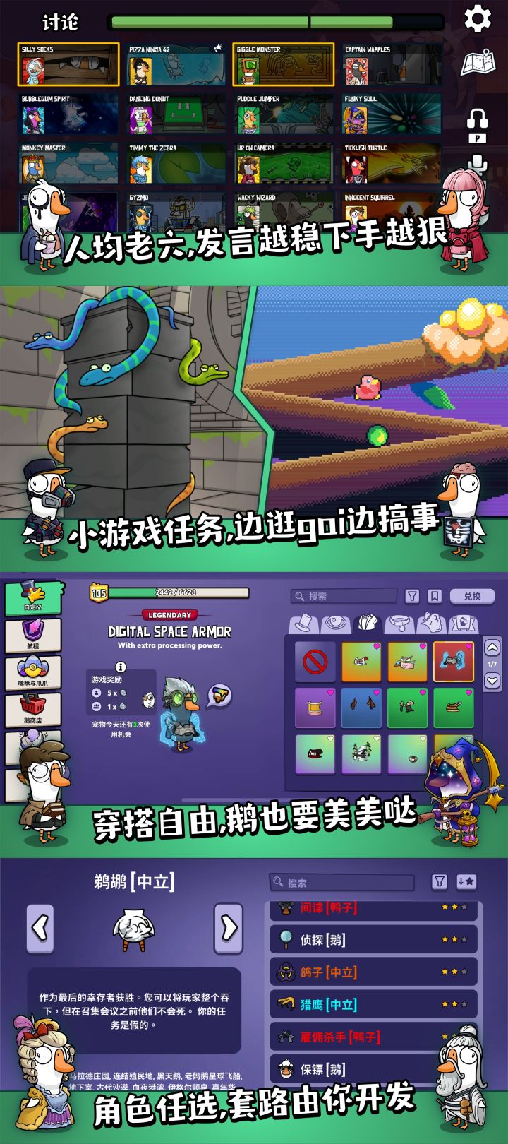 ✅鹅鸭杀简直就是狼人杀的升级版!游戏里有33种奇葩身份,每局都是全新剧本。好人阵营里,“网红鹅”死亡会触发全场哀悼,“正义使者”自带处决技能;坏人阵营的“静音鸭”能让对手在会议上有口难言,“刺客鸭”可以在会议中开枪;中立阵营的“呆呆鸟”靠“求票出局”逆袭,“鹈鹕”吞人后还能和肚中玩家“跨次元对话” ,玩起来欢乐又上头!