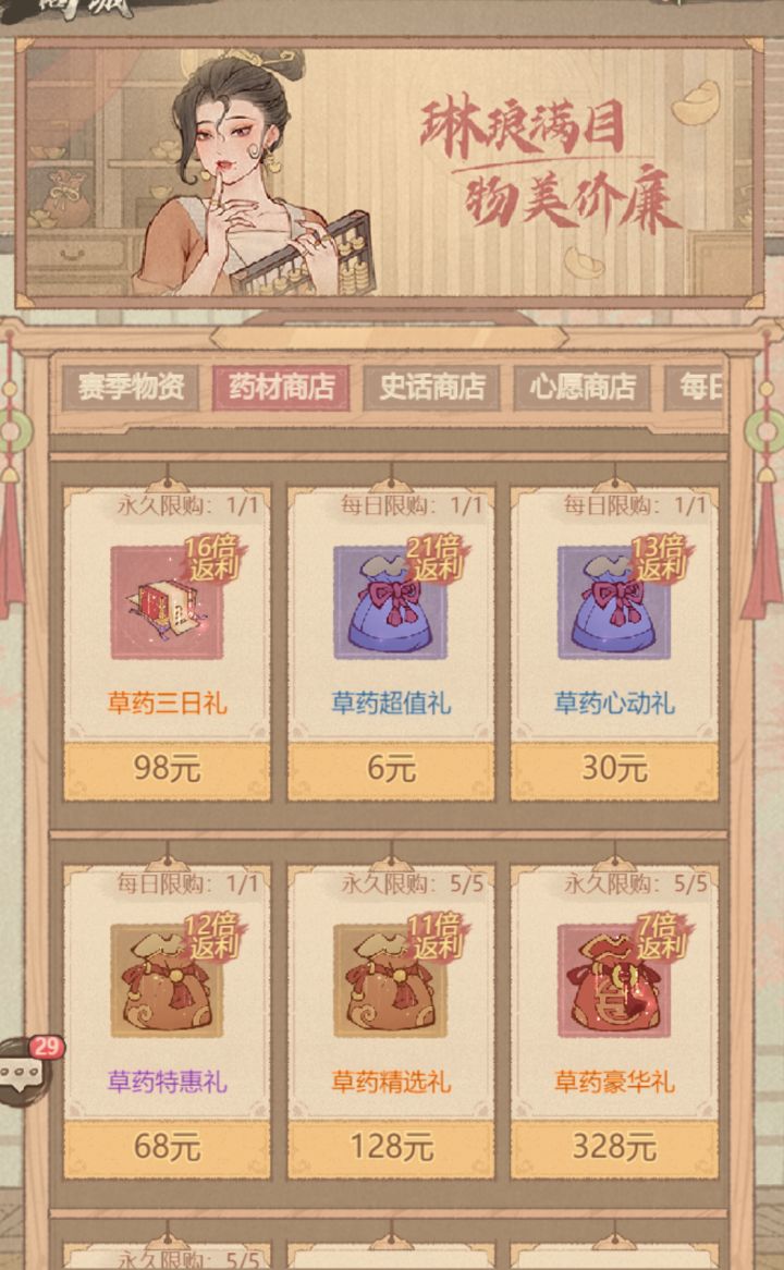 商城礼包:商城推出与活动相关的礼包,玩家可根据自身需求进行购买。其中6元礼包和30元礼包的性价比最高。