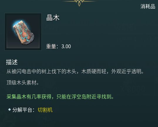 《黑光生存进化》中,晶木是一种重要资源,可用普通伐木斧砍伐晶木获取(获取数量和伐木斧的品质有关,采集完后8小时会重新刷出),分解一个晶木可获得3750木头。