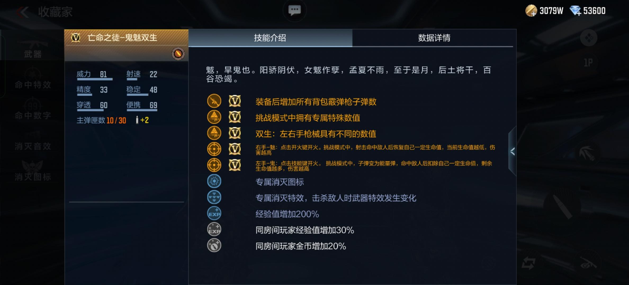 与常规亡命之徒系列的“双管齐发”不同,这把枪的开火逻辑更具策略性:通过主武器开火键操控右手枪管(“魅”部),专属技能键则唤醒左手枪管(“鬼”部)。双枪载弹独立计算,在满天赋与精通等级下,基础载弹量达到14发(右手枪管10发),这意味着即使频繁切换攻击目标,也能保持充沛弹药,中近距离压制能力极强。