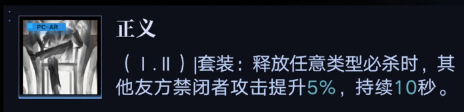 正义(1、2号位)使用技能后可以提高全场攻击(不可叠加),非常泛用的辅助套,可以给任何不打输出的角色,而且都是普级烙印,非常好得,在没有其他花里胡哨的辅助烙印之前,这套可以一直用到后期,三号位通常推荐是回廊空响,没有回廊也可以空着,没关系