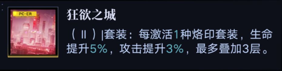 狂欲之城(2号位),在佩戴三个单件烙印时可以提供不错的加成,二号位散件很灵活