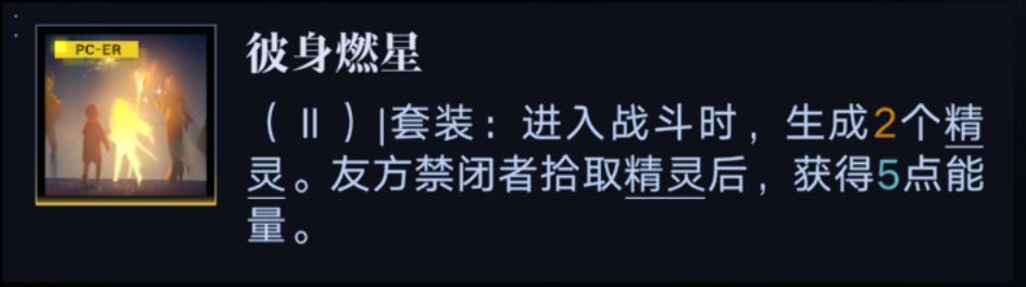 彼身燃星(2号位),可以开局提供两个回5点能量的buff,适合给不需要初动的拐带着给主c补能量,最近更是有位可以无限复活的小哥卡兹安,每次复活归来都可以触发这个套装效果,可以搞出满地燃星