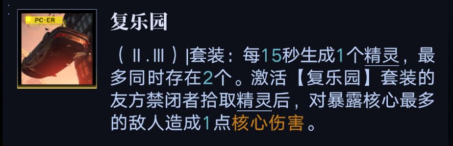 复乐园(2、3号位),一般搭配调律零使用,可以15秒提供一个破核(可以多带几个,但场上最多同时存在两个精灵,带两套以上无意义,带两套也就是加速启动,适合在面对多核心怪时补破核使用,会优先破场上核心数最多的怪,如果核心数一样多,就会破剩余核心数多的怪